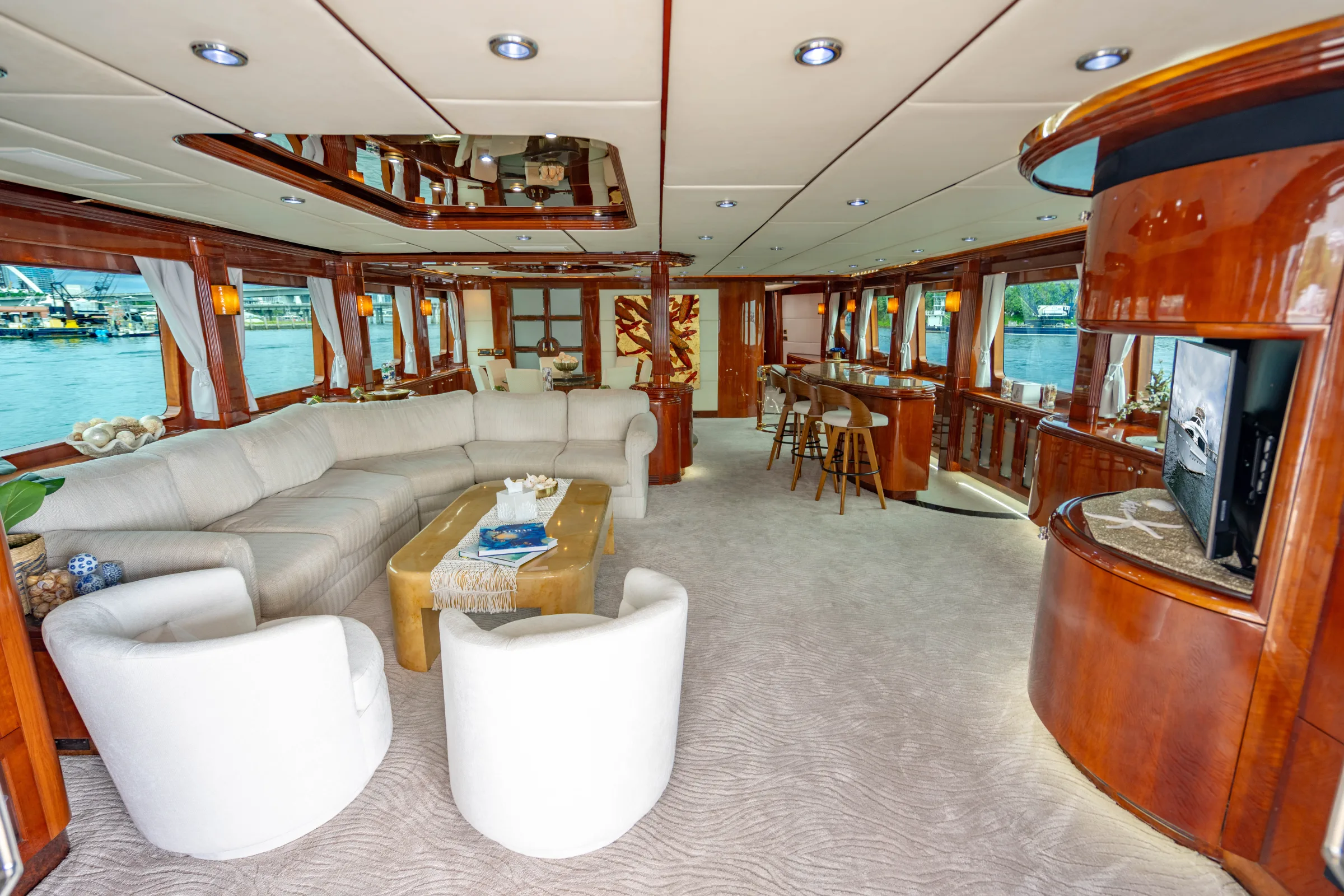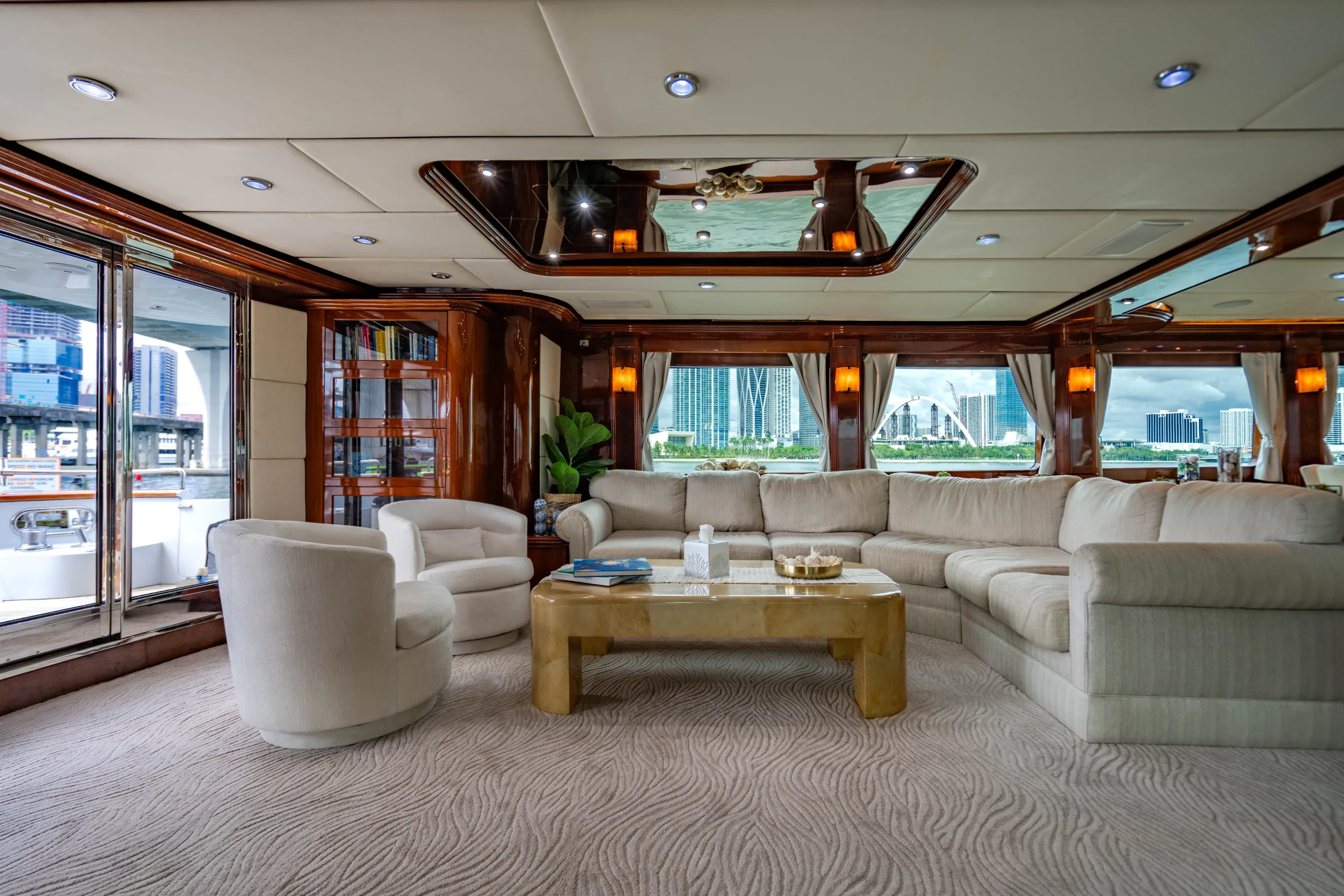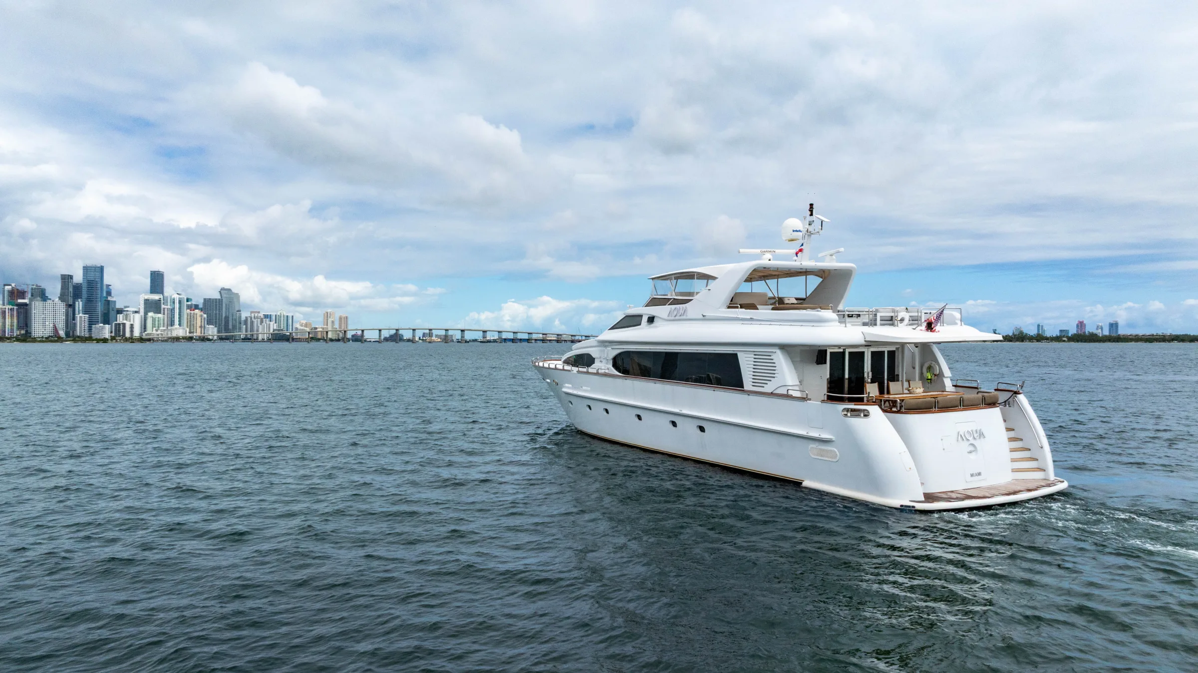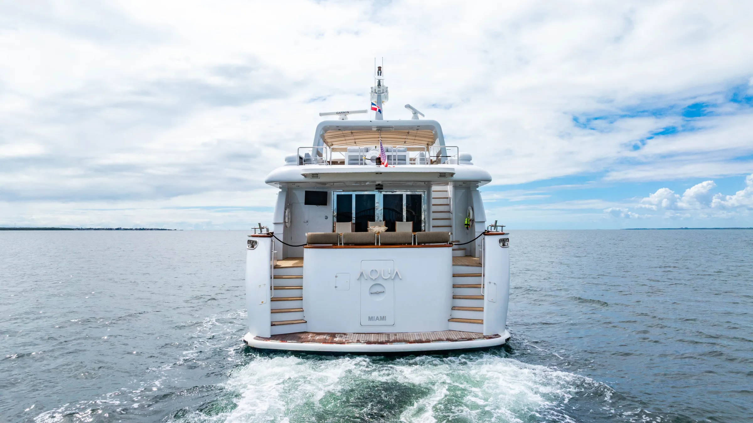 The minimum charter for the 105' AQUA is 4 hours, starting at $4,800. Longer charters are available and popular for special occasions, sunset cruises, and Bahamas trips.
