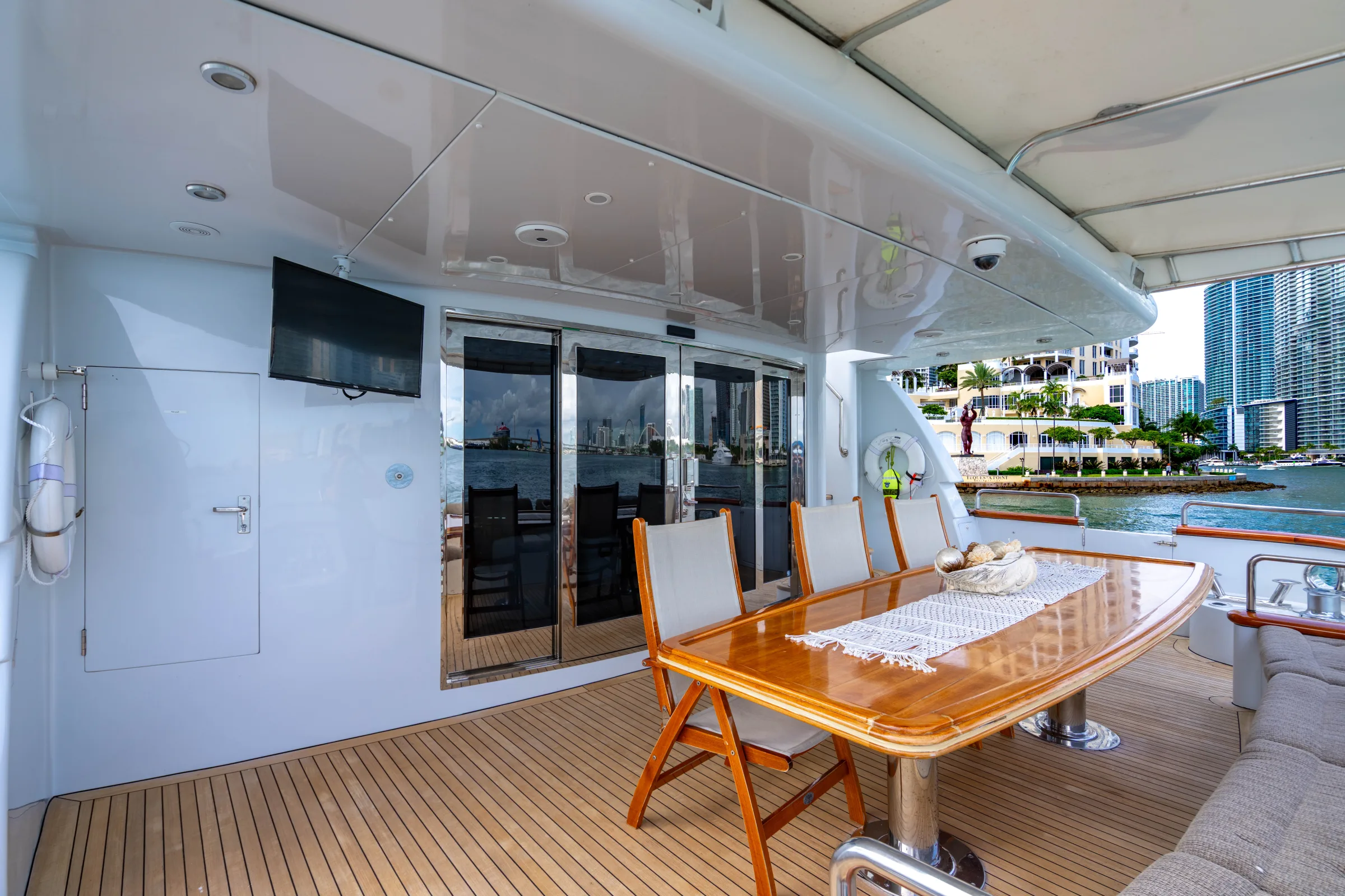 Every charter on the 105' AQUA includes a licensed USCG captain, fuel for the trip, and crew. Gratuity (15–20%) is customary but not mandatory. Add-ons like catering, decorations, and water sports equipment are available for an additional fee.