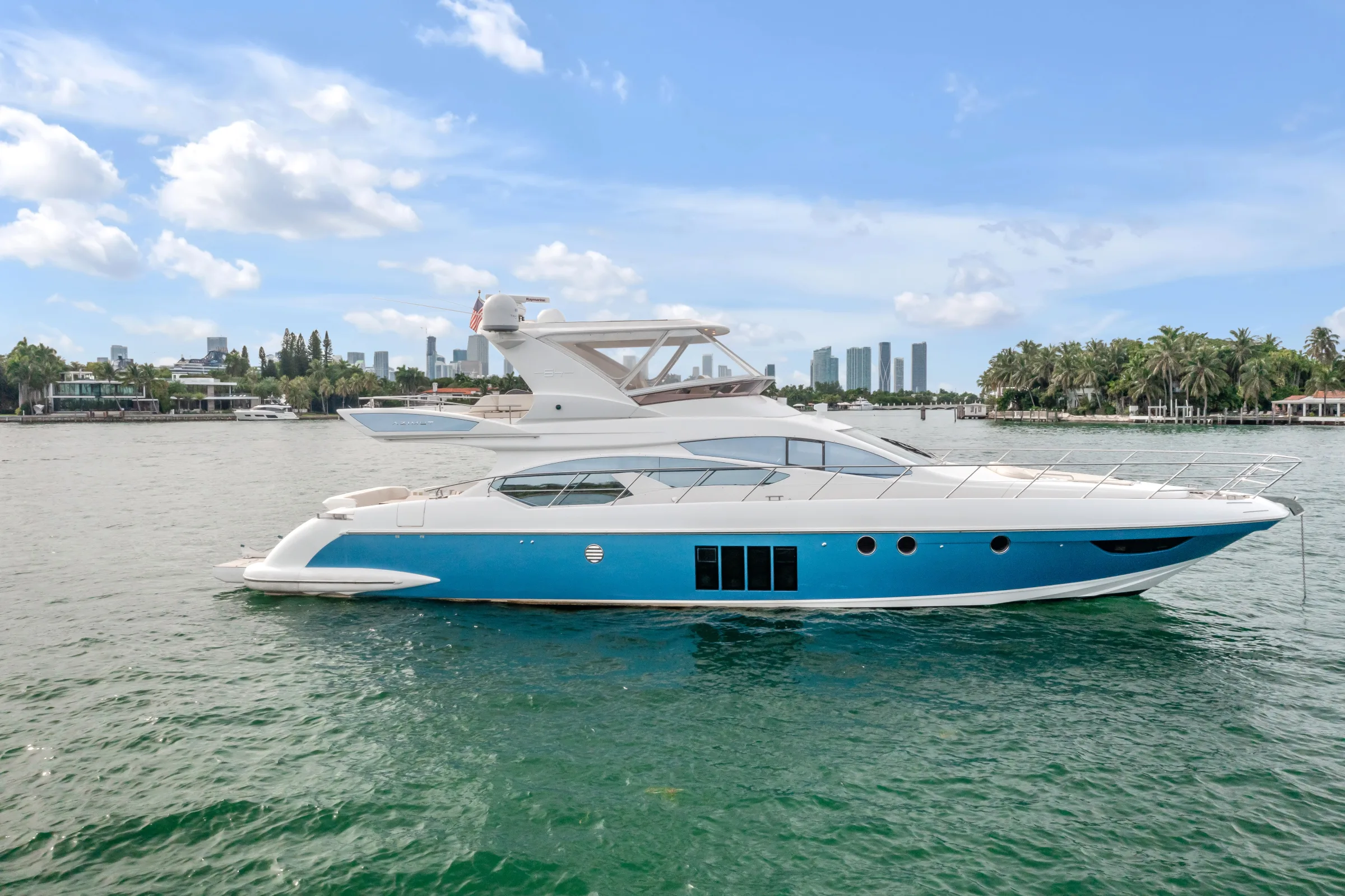 The minimum charter for the 66' Azimut is 4 hours, starting at $3,000. Longer charters are available and popular for special occasions, sunset cruises, and Bahamas trips.